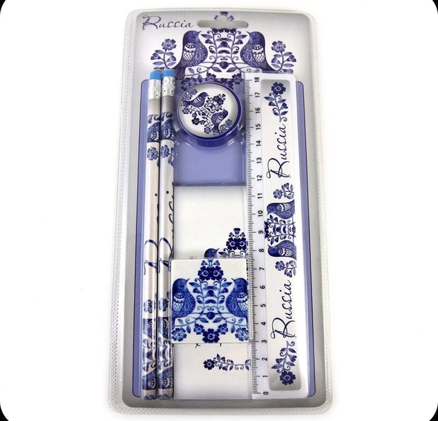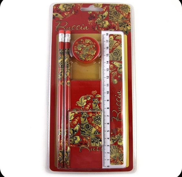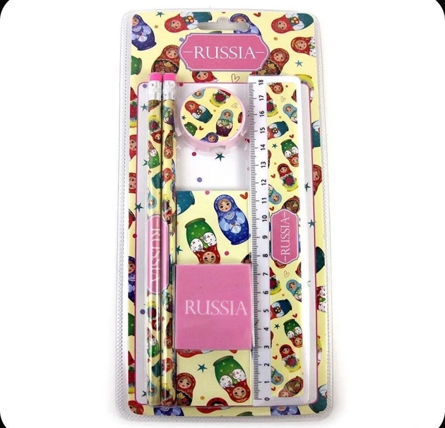 2 карандаша, линейка, точилка, ластик и блокнот.